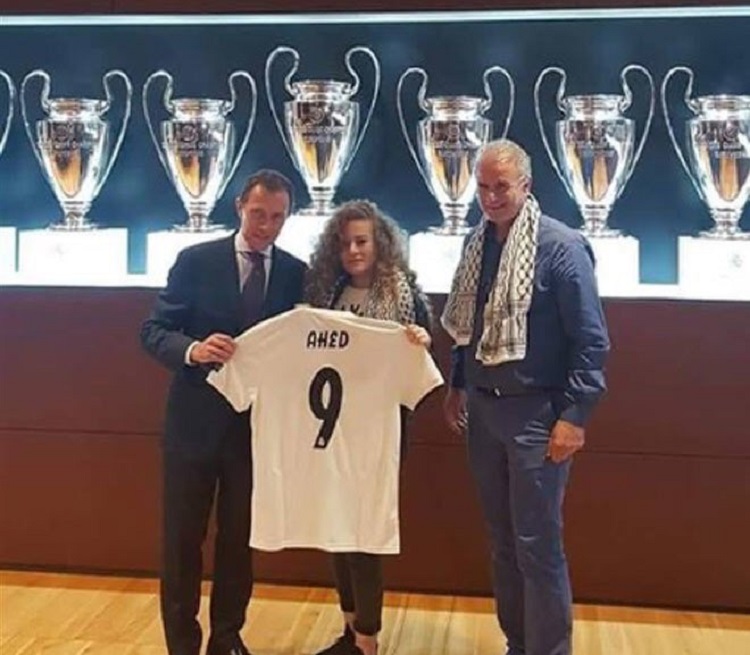 L’image, immortalisant la venue de l’icône de la cause palestinienne dans le stade du célébrissime club de football madrilène, a été massivement relayée sur les réseaux sociaux. On y voit la jeune fille accompagnée de son père recevoir des mains d’Emilio Butragueno, le directeur des relations institutionnelles du Real Madrid, un maillot du club merengue floqué à son prénom.