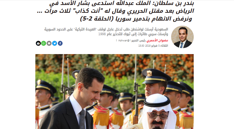 Entre autre, comme le relate Ben Sultane lui-même durant son interview, lorsque le roi Abdallah avait taxé en 2009 le président syrien d’être un menteur pour avoir nié son implication dans l’assassinat de l’ex-Premier ministre saoudien Rafic Hariri. Sachant que Damas avait été innocenté de cet assassinat par la Tribunal international.