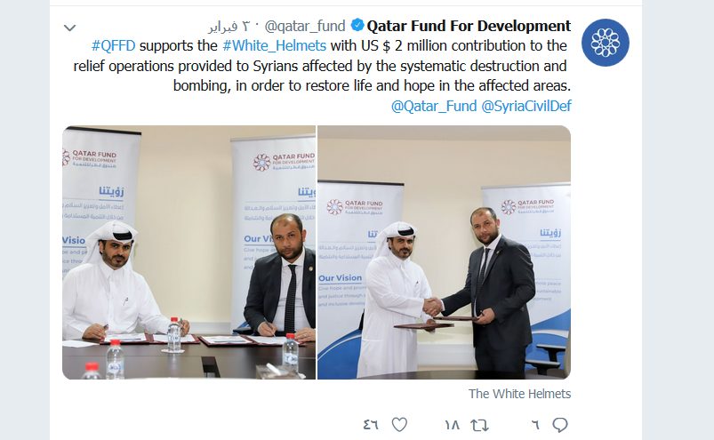 Le Qatar a annoncé le dimanche 3 février dernier vouloir accorder à l’organisation des Casques blancs (CS) la somme de deux millions de dollars américains, a révélé le fond du Qatar pour le développement sur son compte Twitter.