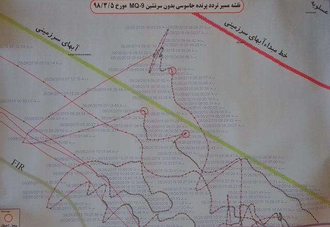 M. Zarif publie avec son tweet une « carte de l’itinéraire du drone espion MQ9 à la date du 26 mai 2019 ».