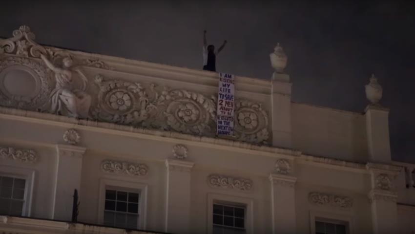La vidéo montre également la police demander au personnel de l’ambassade de « s’éloigner » du protestataire alors qu’il se trouvait sur le toit.
