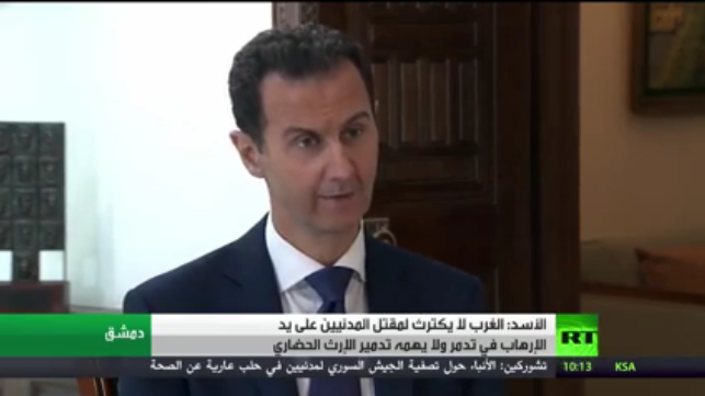Répondant à ces questions alors même que la ville d’Alep vit ses dernières heures de combat et que les rebelles sont sur le point de subir une lourde défaite, Bachar el-Assad a constaté : «Si nous libérons Alep, les politiques occidentaux et les médias mainstream s’inquiéteront alors du sort des civils, alors qu’ils ne s’en préoccupent pas lorsque la situation inverse se produit, lorsque les terroristes tuent des civils et s’emparent de Tadmor » (Palmyre).