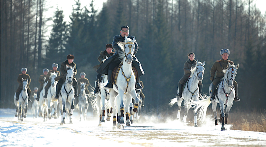 Vêtu d’un imperméable de cuir noir similaire à celui qu’il portait récemment lors de l’inauguration d’un titanesque chantier de ville nouvelle, Kim Jong Un a été photographié en tête d’un groupe de cavaliers dans une forêt enneigée proche du Mont Paektu, volcan endormi à la frontière entre la Corée du Nord et la Chine.