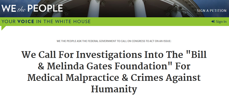 Alors qu’il ne faut que 100 000 signatures pour qu’une pétition soit prise au sérieux par le gouvernement et déclenche sa réaction, la pétition contre la fondation Bill & Melinda Gates est déjà à plus de 443 000 signatures en 17 jours. Inutile donc de vous dire qu’elle a largement dépassé le critère pour être prise en compte. Les États-Unis se verront donc obligés de faire cette enquête sur la fondation Gates.