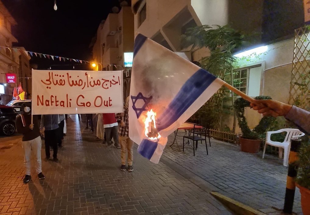 Plusieurs bahreïnis ont brûlé et piétiné des drapeaux israéliens à Manama, en protestation à la visite du Premier ministre israélien Naftali Bennett à Bahreïn.