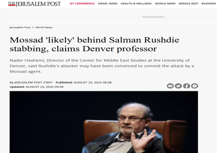 L’attaque au couteau la semaine dernière contre le romancier Salman Rushdie, l’auteur du livre anti-islamique sacrilège, « Versets sataniques » a peut-être été orchestrée par le Mossad, a suggéré Nader Hashemi, directeur du Centre d’études sur le Moyen-Orient à l’Université de Denver, selon le site web du quotidien israélien Jerusalem Post.