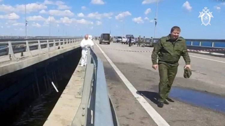 Sur Telegram, la chaîne de télévision publique Crimée-24 a publié une vidéo du pont montrant une portion de sa section routière partiellement effondrée. Le Comité d’enquête a également publié une vidéo, montrant des hommes ramassant des indices sur la chaussée penchant vers la mer.