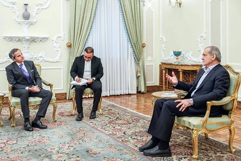Pezeshkian a déclaré jeudi soir lors de sa rencontre avec le directeur général de l’Agence internationale de l’énergie atomique, Rafael Grossi, que « ce que la République islamique d’Iran recherche en matière de technologie nucléaire est conforme aux cadres juridiques et aux licences de l’Agence internationale de l’énergie atomique ».