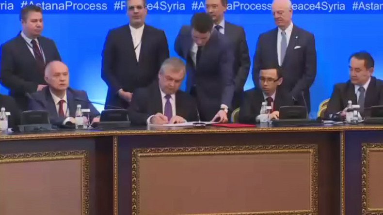 L’avant-texte de l’accord sur la création en Syrie de zones de désescalade dans les provinces d’Idlib, Homs, la Ghouta orientale dans la banlieue de Damas et une région située dans le sud du pays, a enfin été signé, jeudi 4 mai, à Astana, capitale kazakhe.
