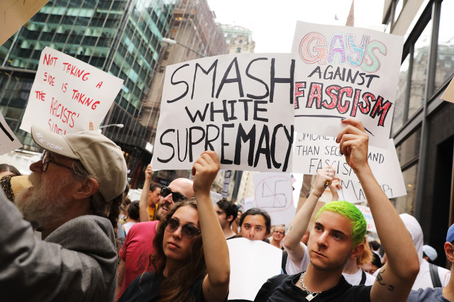 « Nous sommes là pour rester, nous sommes là pour nous battre! »: plusieurs centaines de personnes ont manifesté à nouveau mardi soir sous les fenêtres de Donald Trump à New York, pour notamment dénoncer le racisme après les violences de Charlottesville samedi.