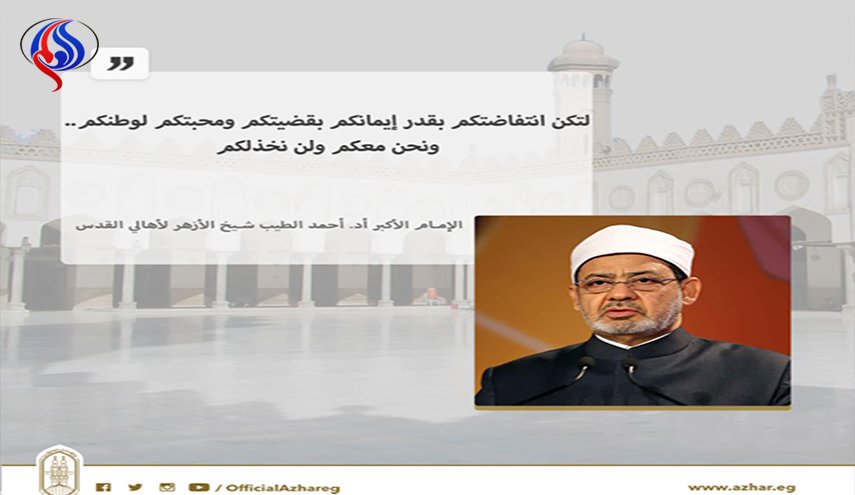 Cheikh Tayeb a affirmé dans un communiqué: « Al-Azhar Al-Sharif suit avec colère, voire il refuse et condamne la décision de l’administration américaine de reconnaitre la ville d’alQods comme capitale d’ une entité occupante et usurpatrice. Sachant que cette mesure est un sans précédent et défie les conventions internationales et les sentiments de plus d’un milliard et demi de musulmans dans le monde , en plus, des sentiments de millions de chrétiens arabes ».