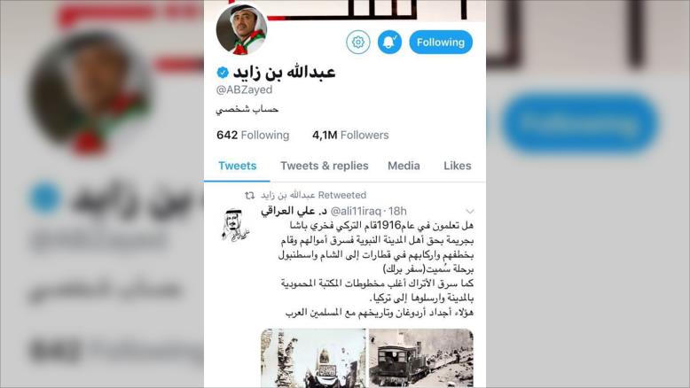 Il répondait à Abdallah Ben Zayed Al-Nahiane qui avait retweeté sur son compte le contenu d’un tweet posté par une personne tierce, disant que les ancêtres d’Erdogan, et plus précisément Fakhreddine qui était alors le gouverneur ottoman de la ville sainte de Médine en 1916 .