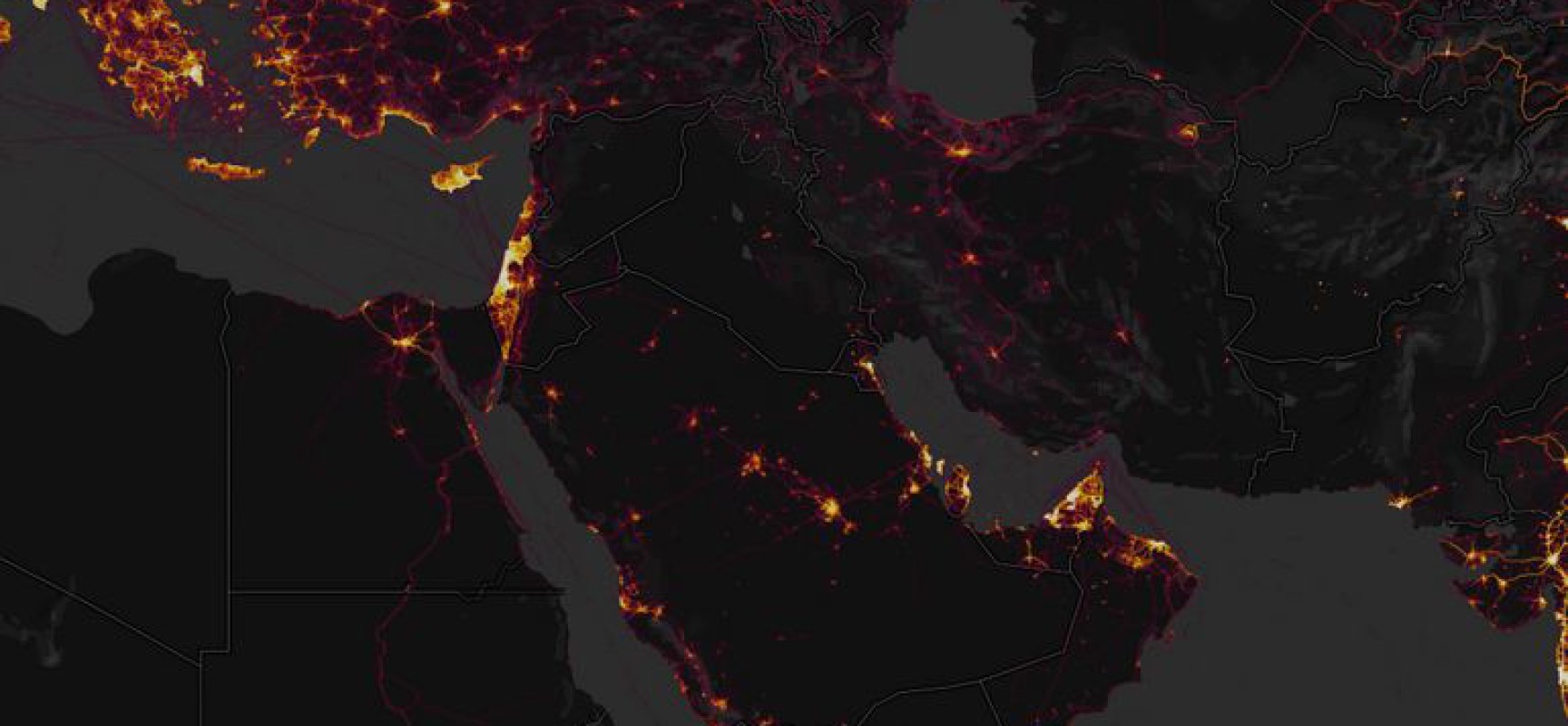 Photo: Au Proche-Orient, des zones d’activité ressortent comme des « phares dans la nuit ».@ Capture d’écran Strava Labs