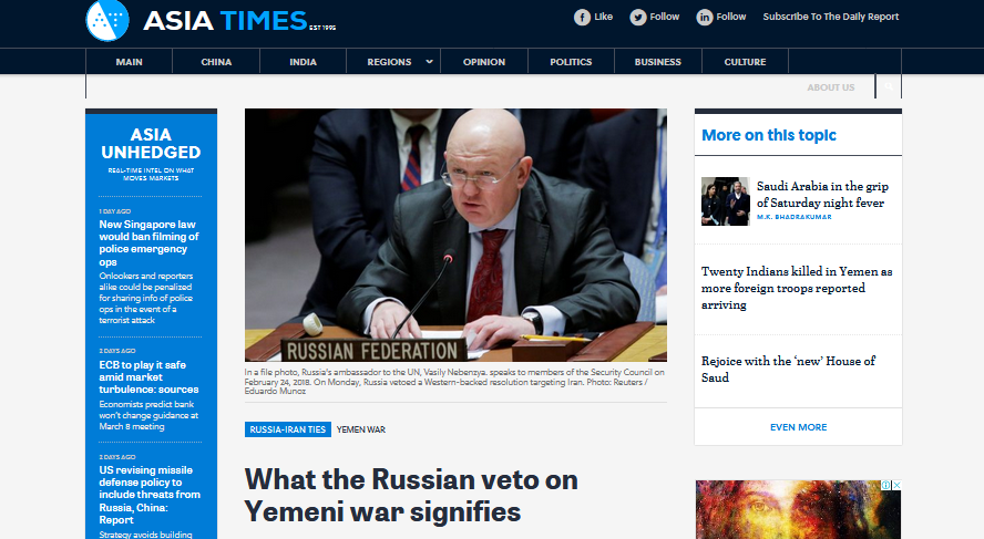 En Syrie, bien sûr, la Russie a exercé son droit de veto à plusieurs reprises, dans l’intérêt de son allié. Mais dans le conflit du Yémen, la Russie n’est ni une participante ni un protagoniste, et elle n’a aucune raison légitime de prendre parti.