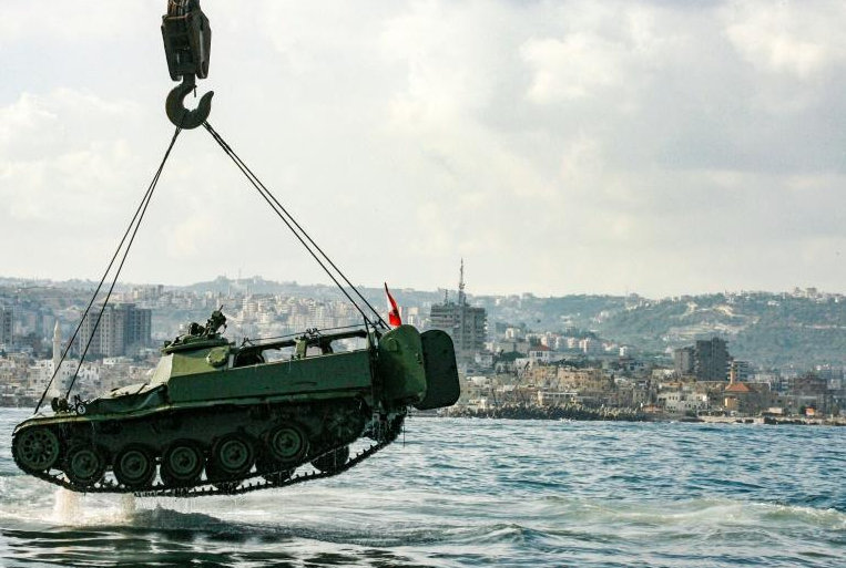 A trois kilomètres de la côte, une grue immense montée sur un bateau a déchargé un à un et lâché dans l’eau les chars et véhicules blindés offerts par l’armée libanaise pour la création de ce « parc sous-marin », a constaté un photographe de l’AFP.